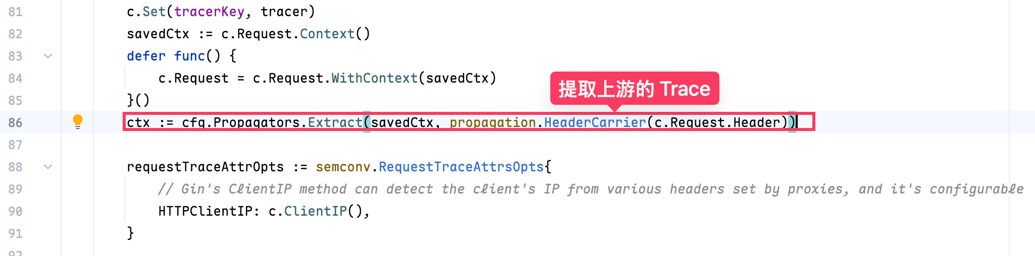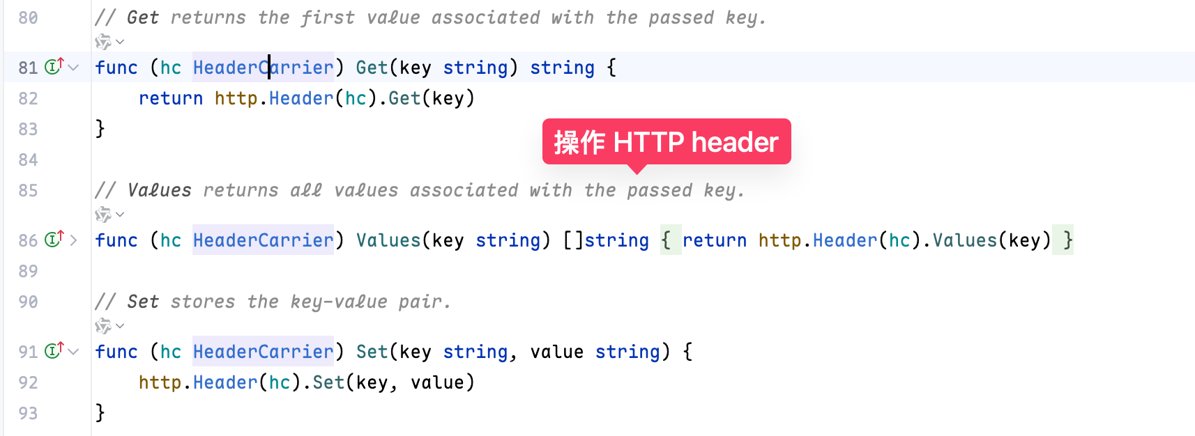 在这个 otelgin 实现的 Middleware 里会使用 HTTP header 来传输 context。