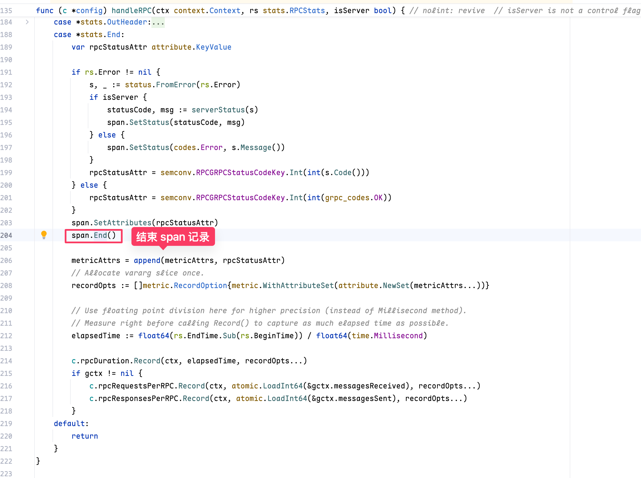 比如在 OpenTelemetry-Go 的 sdk 中,会在一次 RPC 中对 Trace 数据进行埋点。